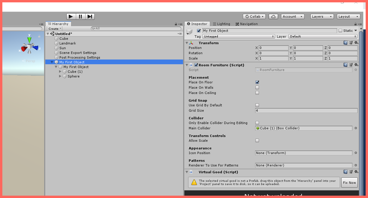 <figure><img src="https://1679086873-files.gitbook.io/~/files/v0/b/gitbook-x-prod.appspot.com/o/spaces%2F5gOE0ivmDtuXfHroTVSx%2Fuploads%2FBt0EiRVhEiM59AKRM3Yx%2FObjects_004.png?alt=media&#x26;token=19dc97cd-59a5-4927-a8f5-826a74e8f7d7" alt=""><figcaption><p>Pictured: "My First Object," with the Virtual Good and Room Furniture components added.</p></figcaption></figure>