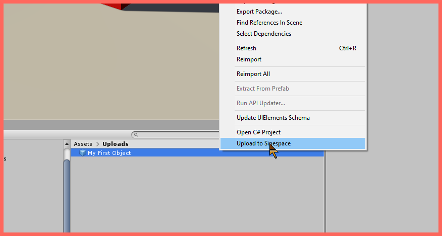 Next, right click on this new prefab object and select **Upload to Sinespace** in the menu that appears.