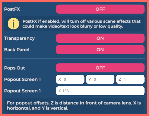 <table><thead><tr><th width="169">Display setting</th><th>Function</th></tr></thead><tbody><tr><td>Post FX</td><td>If set to ON, will turn off various graphics settings within the image viewer <a href="#editing-the-breakroom-image-viewer-collider-zone">collider zone</a> that could distort the image or on-screen text.</td></tr><tr><td>Transparency</td><td>If set to ON, will enable display of images with a transparent background. </td></tr><tr><td>Back Panel</td><td>If set to ON, the image viewer will display a solid rear panel if viewed from the other side. If set to OFF, this panel will be made transparent.</td></tr><tr><td>Pops Out</td><td>If set to ON, image viewer screen will "pop out" to user screen when users enter the image viewer <a href="#editing-the-breakroom-image-viewer-collider-zone">collider zone</a>. The offset and scale of this pop-out screen can be customized by entering values into the associated fields.</td></tr></tbody></table>