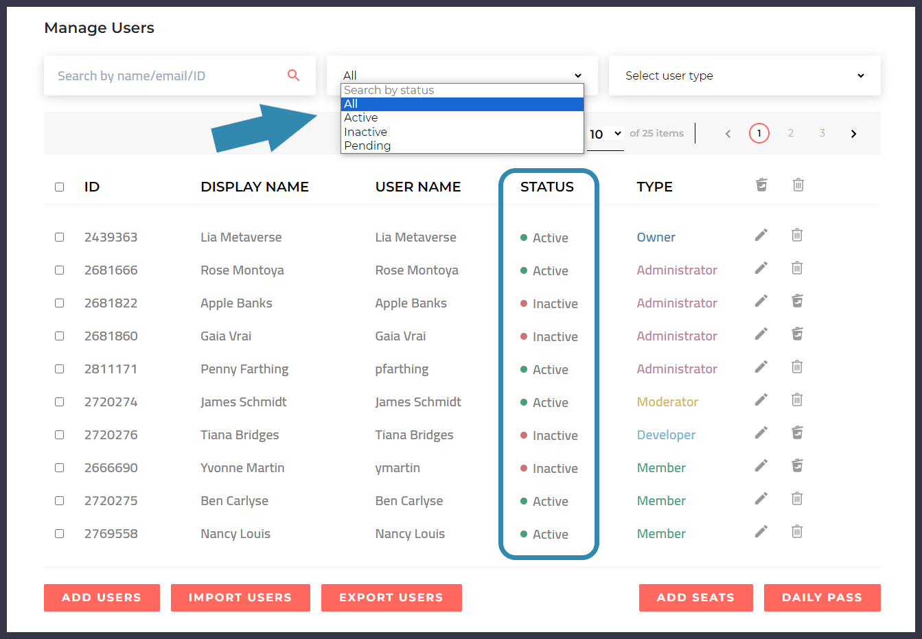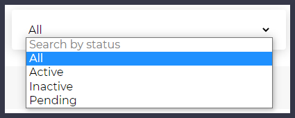 * The **"Search by status" drop-down menu** allows you to display only those users who have a particular status (e.g. active, pending, etc.).