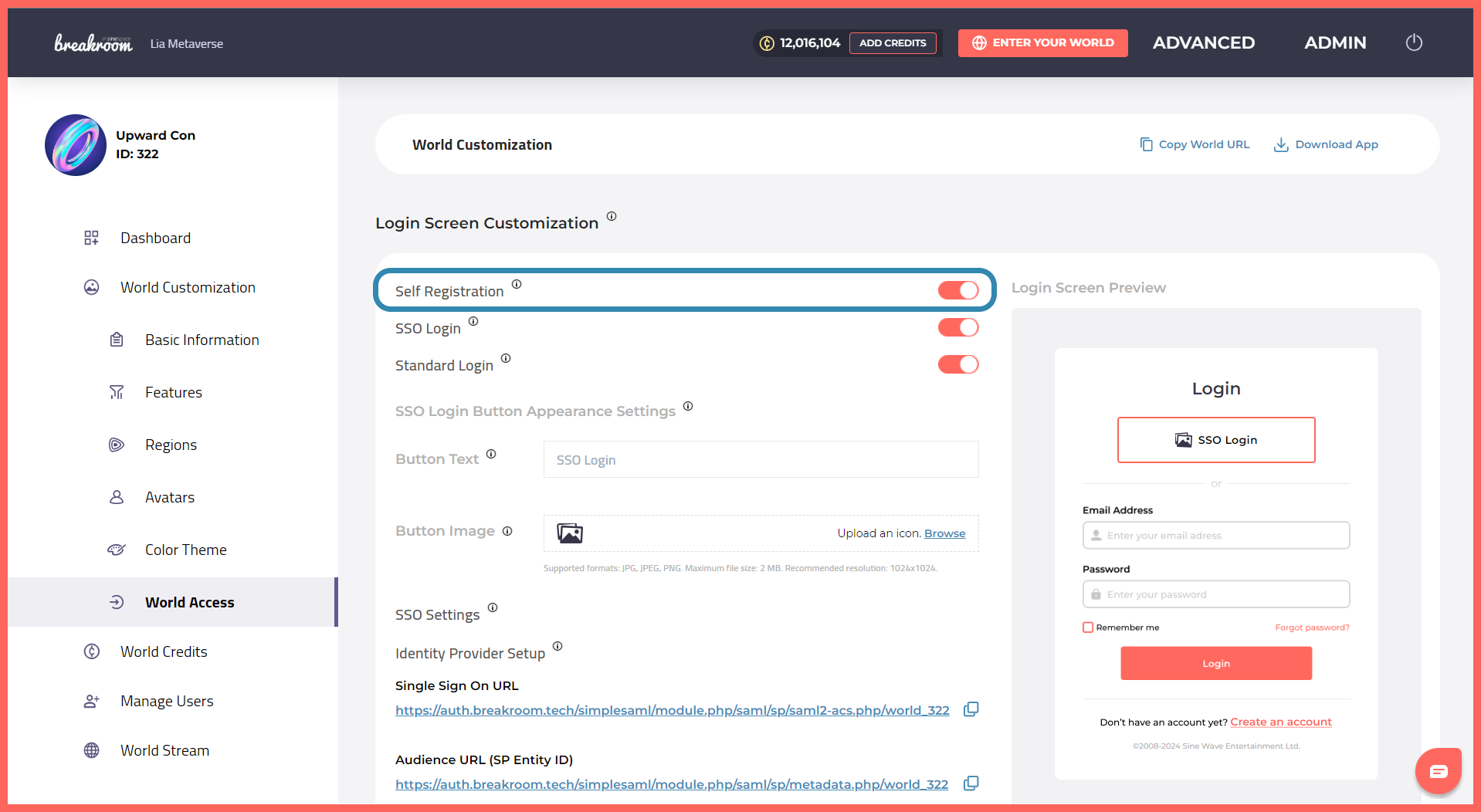 When self-registration is enabled, users who access your World through [World Stream](https://docs.breakroom.tech/opening-the-doors/world-stream) or a dedicated [desktop app](https://docs.breakroom.tech/opening-the-doors/desktop-viewers) can sign up for their own account. Each user registration will take up one of your available [seats](https://docs.breakroom.tech/opening-the-doors/seats-and-concurrency), and users will be given the opportunity to pick a [starter avatar](https://docs.breakroom.tech/getting-started/customizing-your-avatar/choosing-a-starter-avatar) from your default avatar collection.