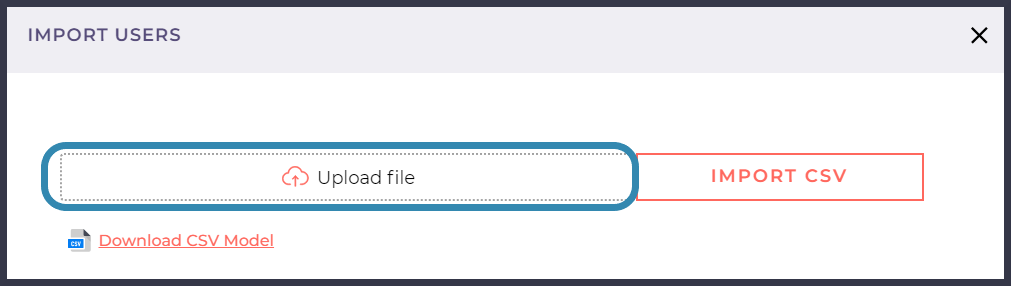 In the Import Users window that appears, click the "**Upload file" field**. This will launch a standard file import window on your computer. Locate the CSV file you want to upload, click on it, and then click the **Open button**.
