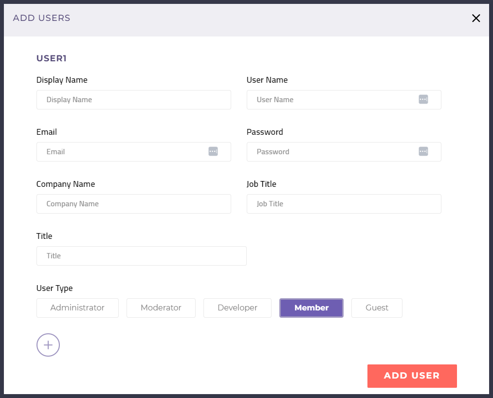 If you want to add more than one user during a single session, click the **plus icon** in the bottom left corner to generate an additional set of user information fields. When you are finished keying in your user data, click the **Add User button**.