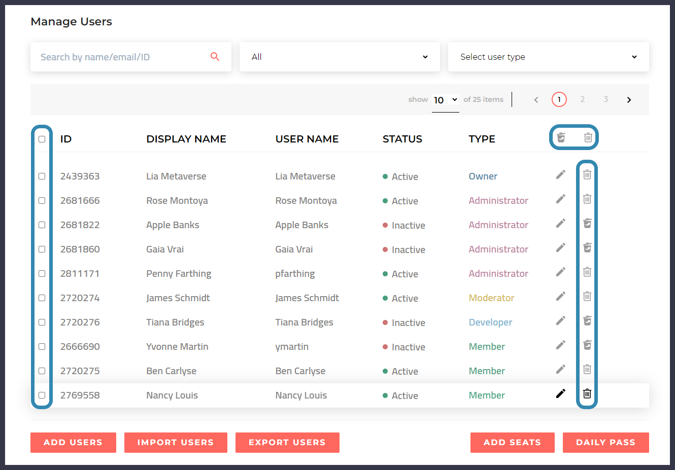 To deactivate or activate multiple users at once, check off each relevant name in your user list and then click the **trash can icon** or **undo icon** located in the top right above the user list.