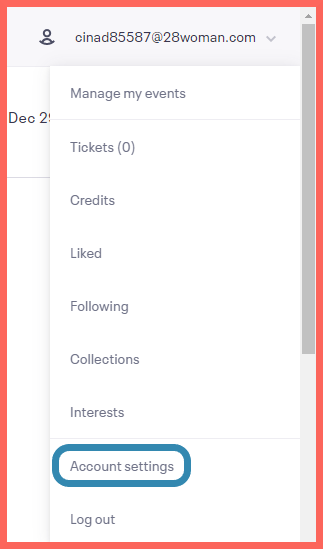 <figure><img src="https://1679086873-files.gitbook.io/~/files/v0/b/gitbook-x-prod.appspot.com/o/spaces%2F5gOE0ivmDtuXfHroTVSx%2Fuploads%2FWJVph87112l2lX5yDp0w%2FEventbrite_002.png?alt=media&#x26;token=d3054398-f49f-4a3f-927d-2bbf8c7bc196" alt="" width="242"><figcaption><p>Highlighted: The location of the Account settings page on Eventbrite.</p></figcaption></figure>