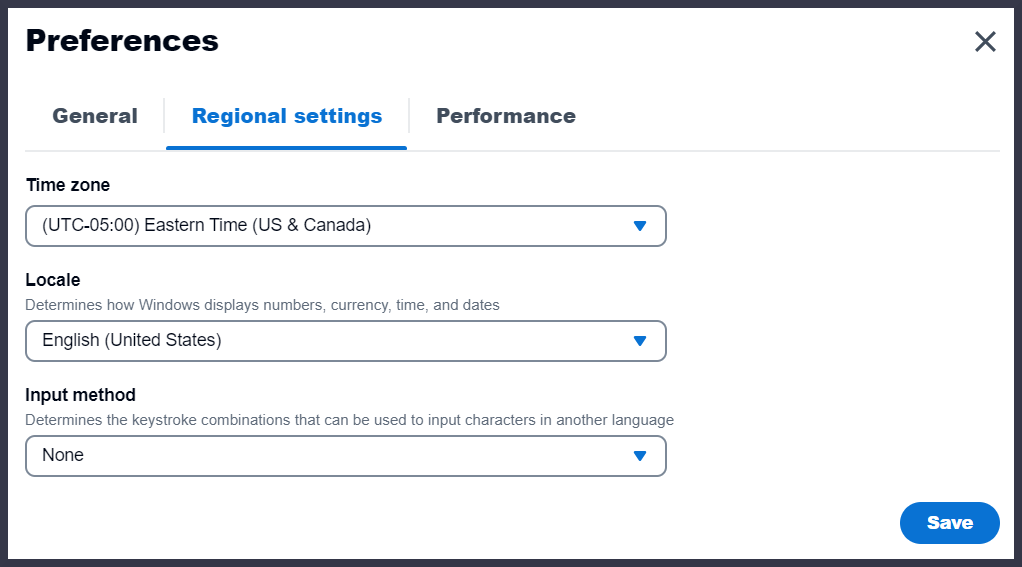 Clicking on the **Preferences > Regional settings tab** allows you to customize your time zone and geographical location.