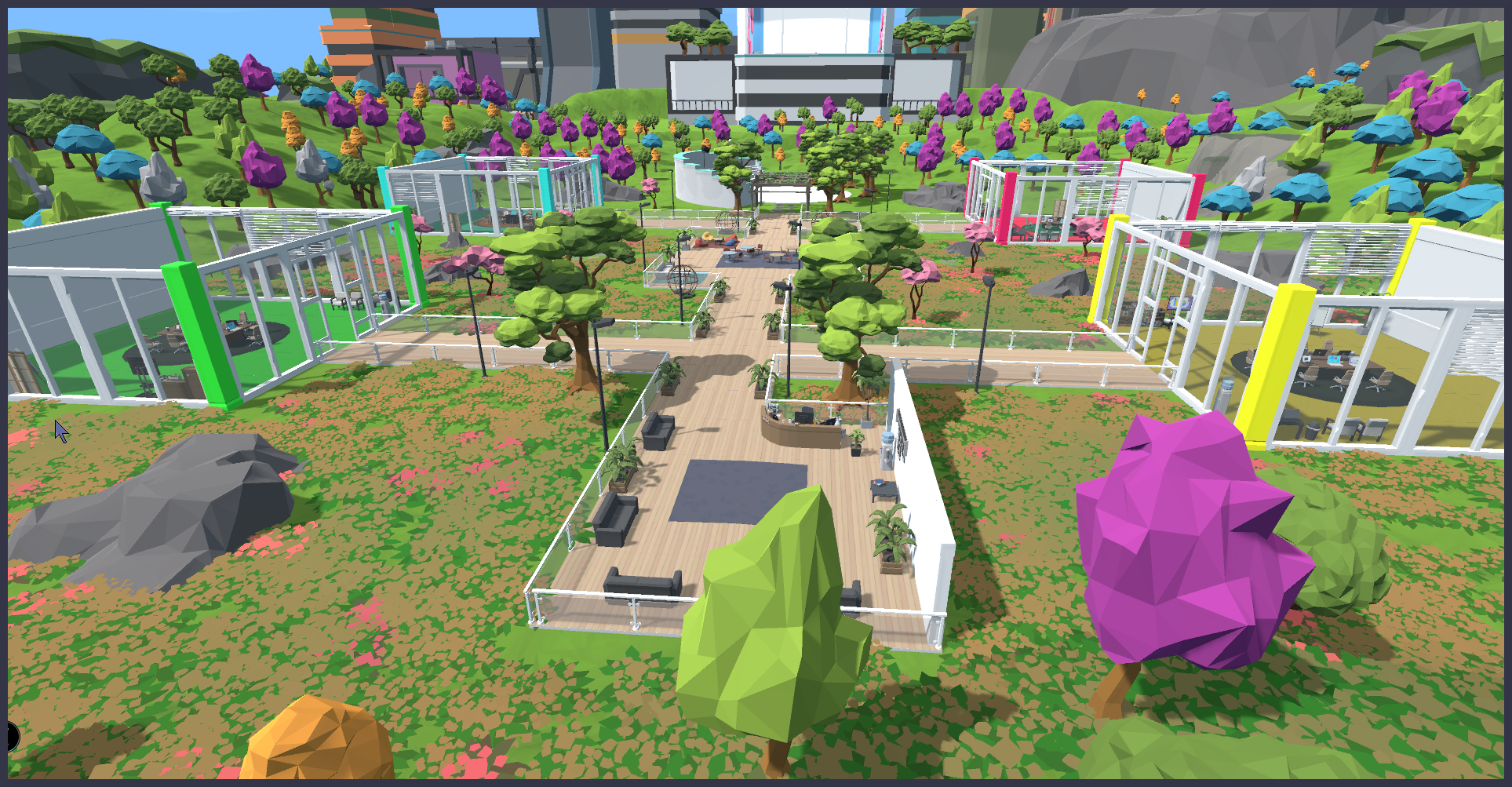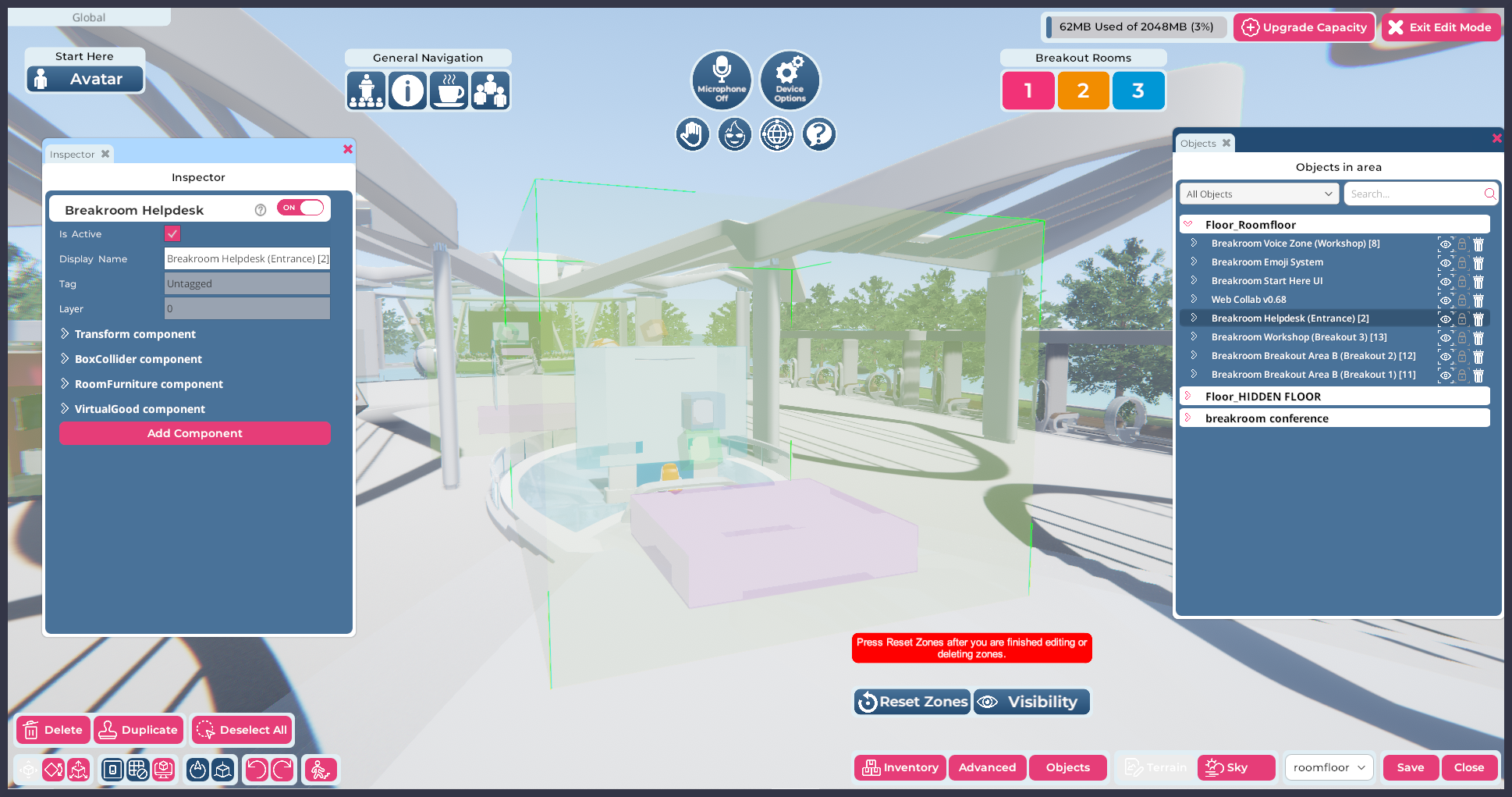 The image above is a flyover shot of the Breakroom Campus Large Region. You can see that it consists of several lobbies, meeting rooms, and an amphitheater, as well as trees and gardens. Everything you see here is contained inside the *Global voice zone*.